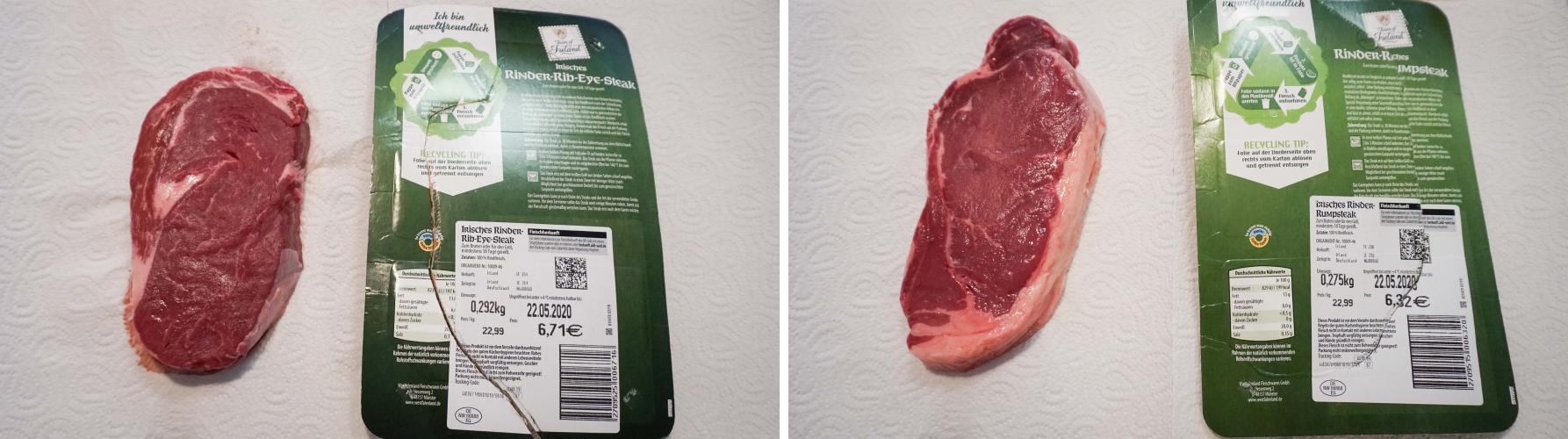 두 가지 종류의 스테이크를 사 왔는데, 하나는 립아이 하나는 럼프 스테이크입니다.