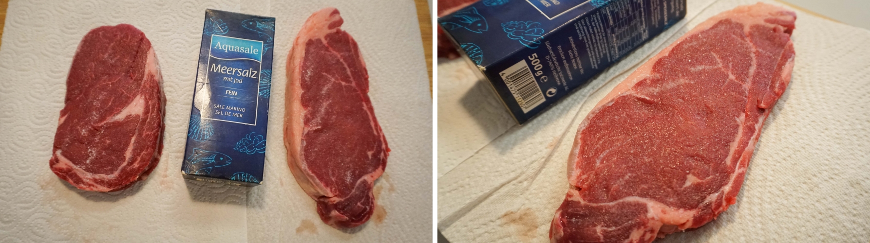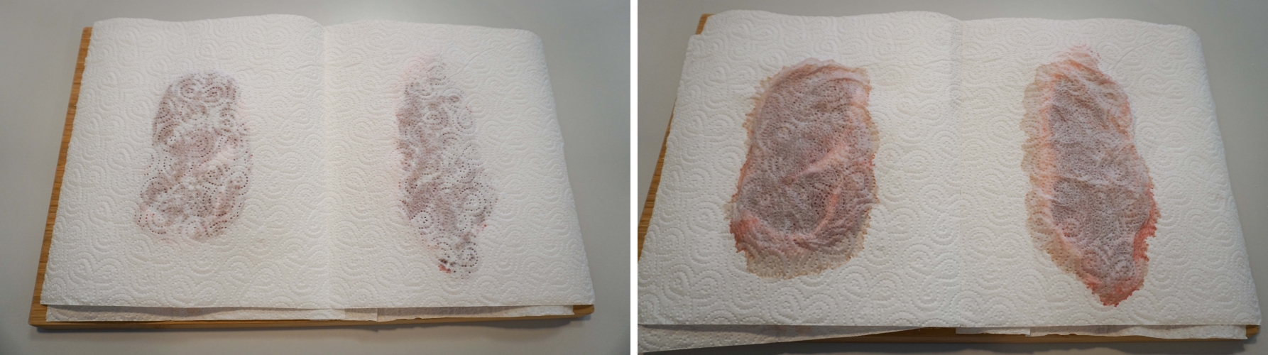 소금간 전 후 비교 처음에는 소금을 뿌려두면 삼투압 현상으로 고기의 핏물, 수분이 키친타월로 빠집니다.
